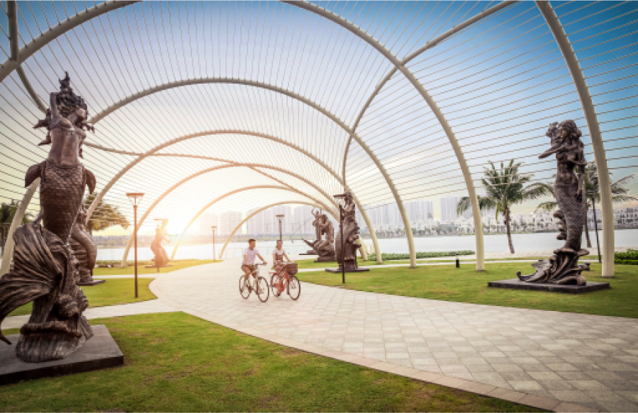 Quảng Trường Cá Voi có không gian rộng lớn, thoáng đãng, thích hợp cho các hoạt động ngoài trời như đi bộ, ngồi nghỉ ngơi, và tận hưởng không khí trong lành.